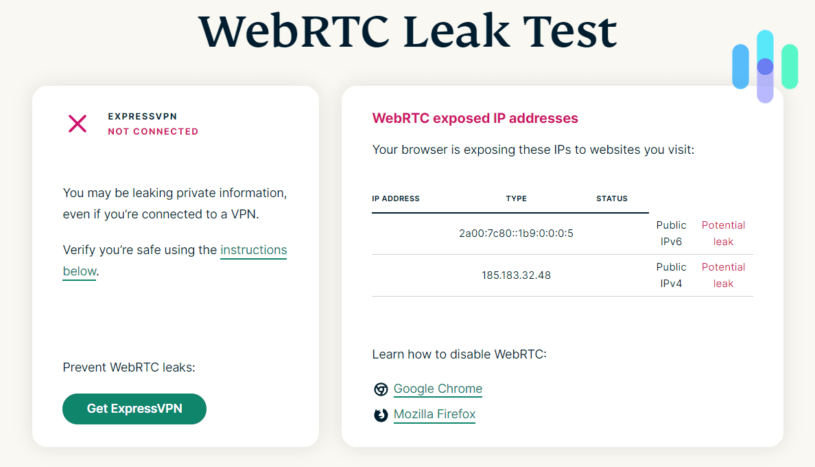 - WebRTC leak: Another type of IP address leak, WebRTC leaks enable third-party actors to use the WebRTC function of browsers to detect the IP address of a user.